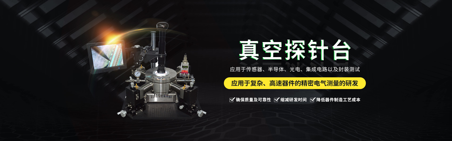 微型真空探針臺(tái)設(shè)計(jì)有進(jìn)氣口和抽真空接口其真空度用機(jī)械泵可達(dá)<5Pa分子泵可達(dá)<-3Pa。真空信號(hào)連接處使用高級(jí)真空電極信號(hào)接頭,保證氣密性及抗干擾性能。使用時(shí)將需將待檢測(cè)的器件方在加熱臺(tái)面,探針尖處由...